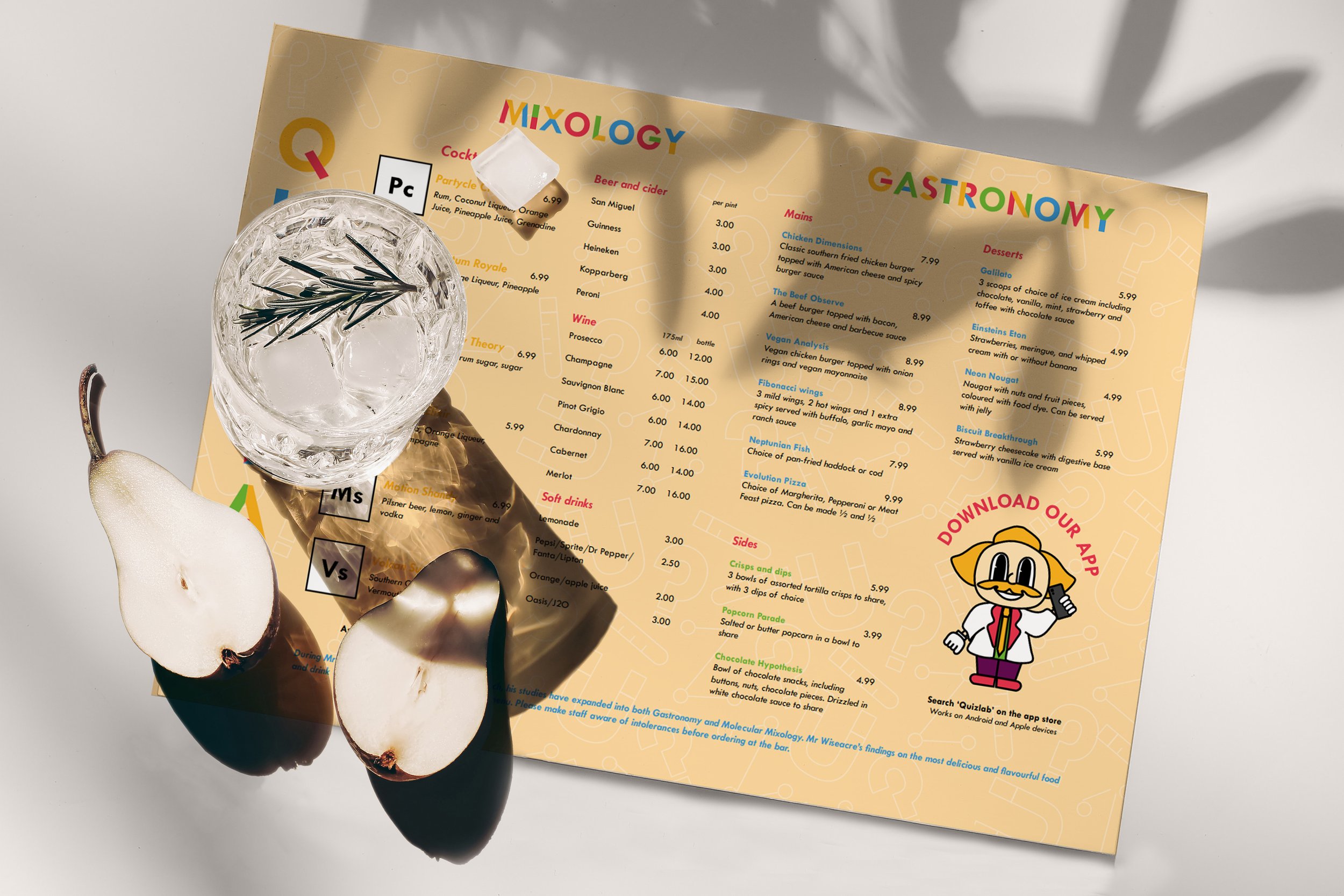 The project features a mascot, known as Mr Wiseacre, a mad scientist of Quizology. With this, all outcomes have a science theme, which is most prevalent amongst the menu.